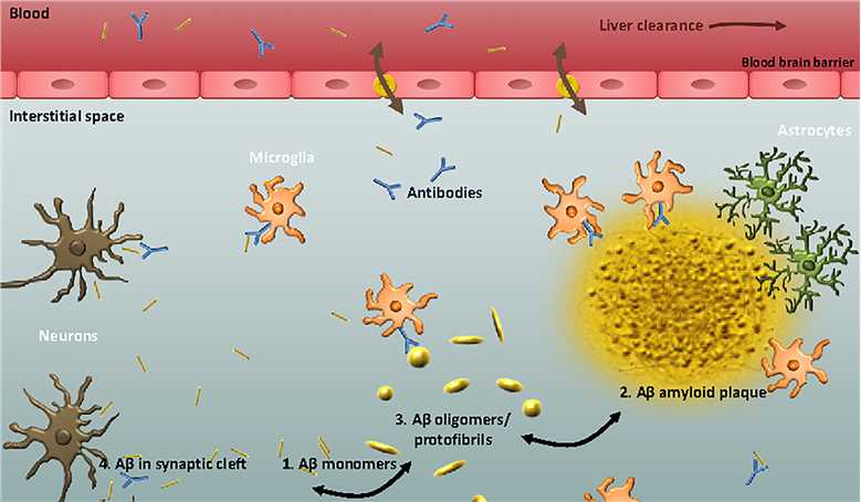 Figure 1. Possible targets for anti-Aβ immunotherapy. (Adapted from Lannfelt L.; et al. Amyloid‐β‐directed immunotherapy for Alzheimer’s disease. Journal of Internal Medicine. 2014, 275(3): 284-295.)