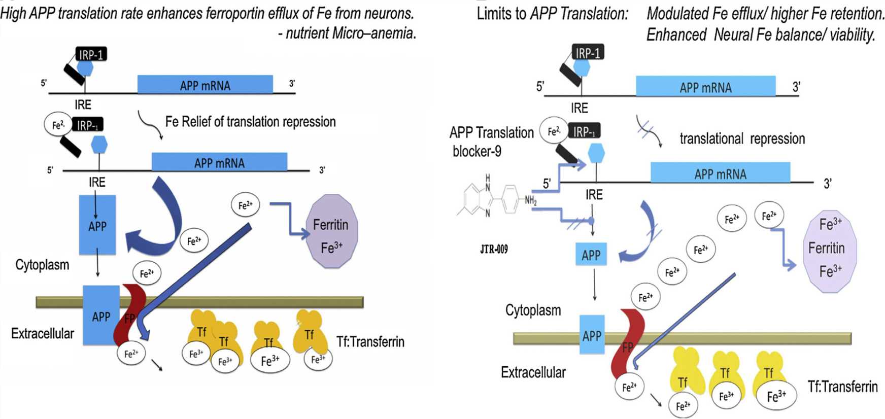 Figure 1. Model for cooperative translation of APP by IRP1 and facilitated FPN dependent export. (Bandyopadhyay S, Rogers J T. Alzheimer’s disease therapeutics targeted to the control of amyloid precursor protein translation: Maintenance of brain iron homeostasis. Biochemical Pharmacology. 2014. 88(4): 486-494.)