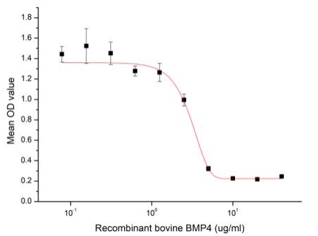 BMP4 (Bone morphogenetic protein 4) is a member of the bone morphogenetic protein family, which is involved in bone and cartilage development, specifically tooth and limb development and fracture repair. To test the effect of BMP4 on cell apoptosis, HepG2 cells were seeded into triplicate wells of 96-well plates at a density of 4,000 cells/well and allowed to attach overnight, then the medium was replaced with various concentrations of recombinant bovine BMP4 diluted with 5% serum standard DMEM. After incubated for 72h, cells were observed by inverted microscope and cell proliferation was measured by Cell Counting Kit-8 (CCK-8). Briefly, 10 µl of CCK-8 solution was added to each well of the plate, then the absorbance at 450 nm was measured using a microplate reader after incubating the plate for 1-4 hours at 37°C. Apoptosis of HepG2 cells after incubation with BMP4 for 72h observed by inverted microscope was shown. Cell viability was assessed by CCK-8 (Cell Counting Kit-8 ) assay after incubation with recombinant bovine BMP4 for 72h. BMP4 significantly decreased cell viability of HepG2 cells. The ED50 of recombinant bovine BMP4 is 3.07 ug/ml. |