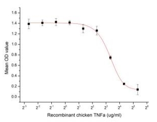 Tumor necrosis factor (TNF, tumor necrosis factor alpha, TNFα, cachexin, orcachectin) is a cell signaling protein (cytokine) involved in systemic inflammation and is one of the cytokines that make up the acute phase reaction. The primaryrole of TNF is in the regulation of immune cells. TNF, being an endogenouspyrogen, is able to induce fever, apoptotic cell death, cachexia, inflammation and to inhibit tumorigenesis and viral replication and respond to sepsis viaIL1&IL6 producing cells. To test the effect of TNFα on cell apoptosis, A549 cells were seeded into triplicate wells of 96-well plates at a density of 4,000 cells/well and allowed to attach overnight, then the medium was replaced with various concentrations of recombinant chicken TNFa diluted with 5% serum standard DMEM. After incubated for 72h, cells were observed by inverted microscope and cell proliferation was measured by Cell Counting Kit-8 (CCK-8). Briefly, 10µl of CCK-8 solution was added to each well of the plate, then the absorbance at 450nm was measured using a microplate reader after incubating the plate for 1hat 37°C. Proliferation of A549 cells after incubation with TNFα for 72h observedbyinverted microscope was shown. Cell viability was assessed by CCK-8 (Cell Counting Kit-8 ) assay after incubation with recombinant chicken TNFα for 72h. It wasobvious that TNFα significantly inhibit cell viability of A549 cells. The ED50 is 9.75μg/mL. |