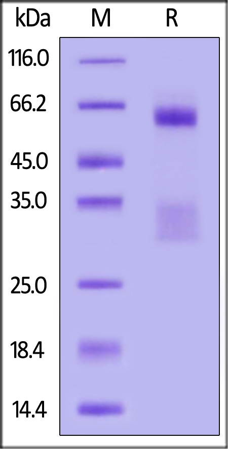 | Molecular Mass : | The protein has a calculated MW of 47.1 kDa. The protein migrates as 30-35 kDa and 60-66 kDa under reducing (R) condition (SDS-PAGE) due to glycosylation. |