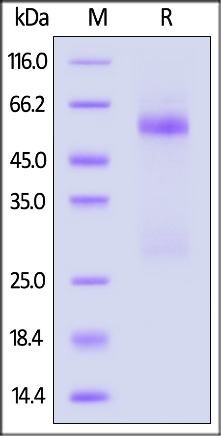 | Molecular Mass : | The protein has a calculated MW of 47.1 kDa. The protein migrates as 55-60 kDa under reducing (R) condition (SDS-PAGE) due to glycosylation. |