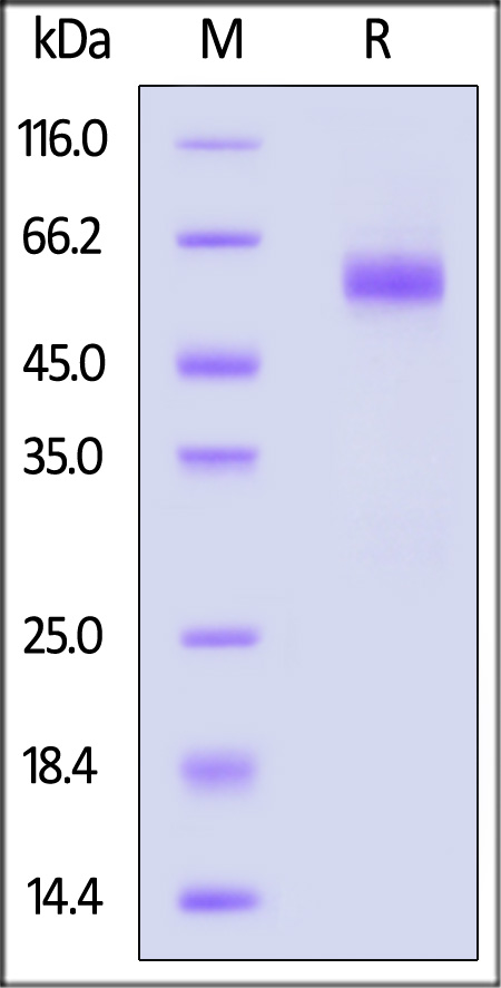 | Molecular Mass : | The protein has a calculated MW of 47.1 kDa. The protein migrates as 55-60 kDa under reducing (R) condition (SDS-PAGE) due to glycosylation. |