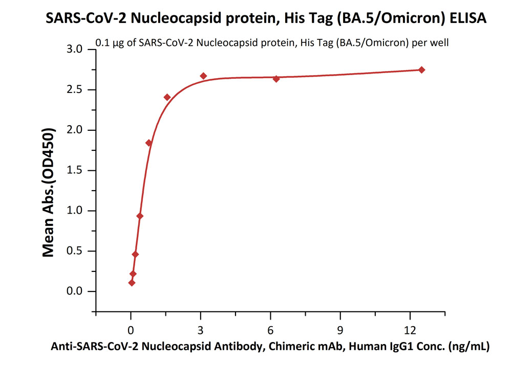| Bio-activity : | Immobilized SARS-CoV-2 Nucleocapsid protein, His Tag (BA.5/Omicron) at 1 μg/mL (100 μL/well) can bind Anti-SARS-CoV-2 Nucleocapsid Antibody, Chimeric mAb, Human IgG1 with a linear range of 0.1-2 ng/Ml. |