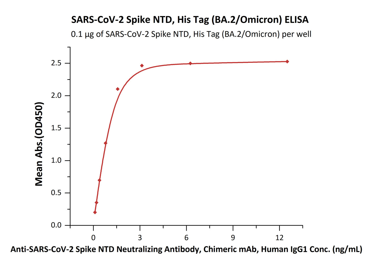 | Bio-activity : | Immobilized SARS-CoV-2 Spike NTD, His Tag (BA.2/Omicron) at 1 μg/mL (100 μL/well) can bind Anti-SARS-CoV-2 Spike NTD Neutralizing Antibody, Chimeric mAb, Human IgG1 with a linear range of 0.1-2 ng/mL. |
