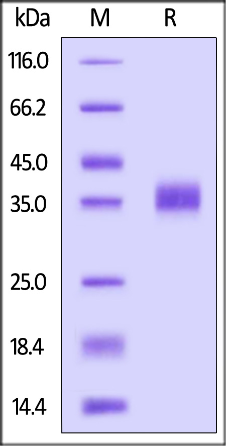 | Molecular Mass : | The protein has a calculated MW of 28.4 kDa. The protein migrates as 35-40 kDa under reducing (R) condition (SDS-PAGE) due to glycosylation. |