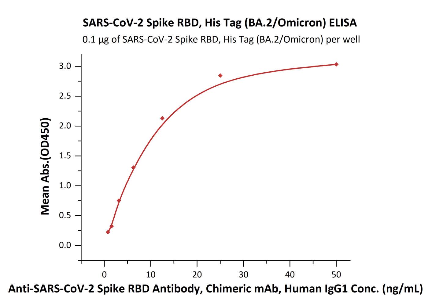 | Bio-activity : | Immobilized SARS-CoV-2 Spike RBD, His Tag (BA.2/Omicron) at 1 μg/mL (100 μL/well) can bind Anti-SARS-CoV-2 Spike RBD Antibody, Chimeric mAb, Human IgG1 with a linear range of 0.8-13 ng/mL. |