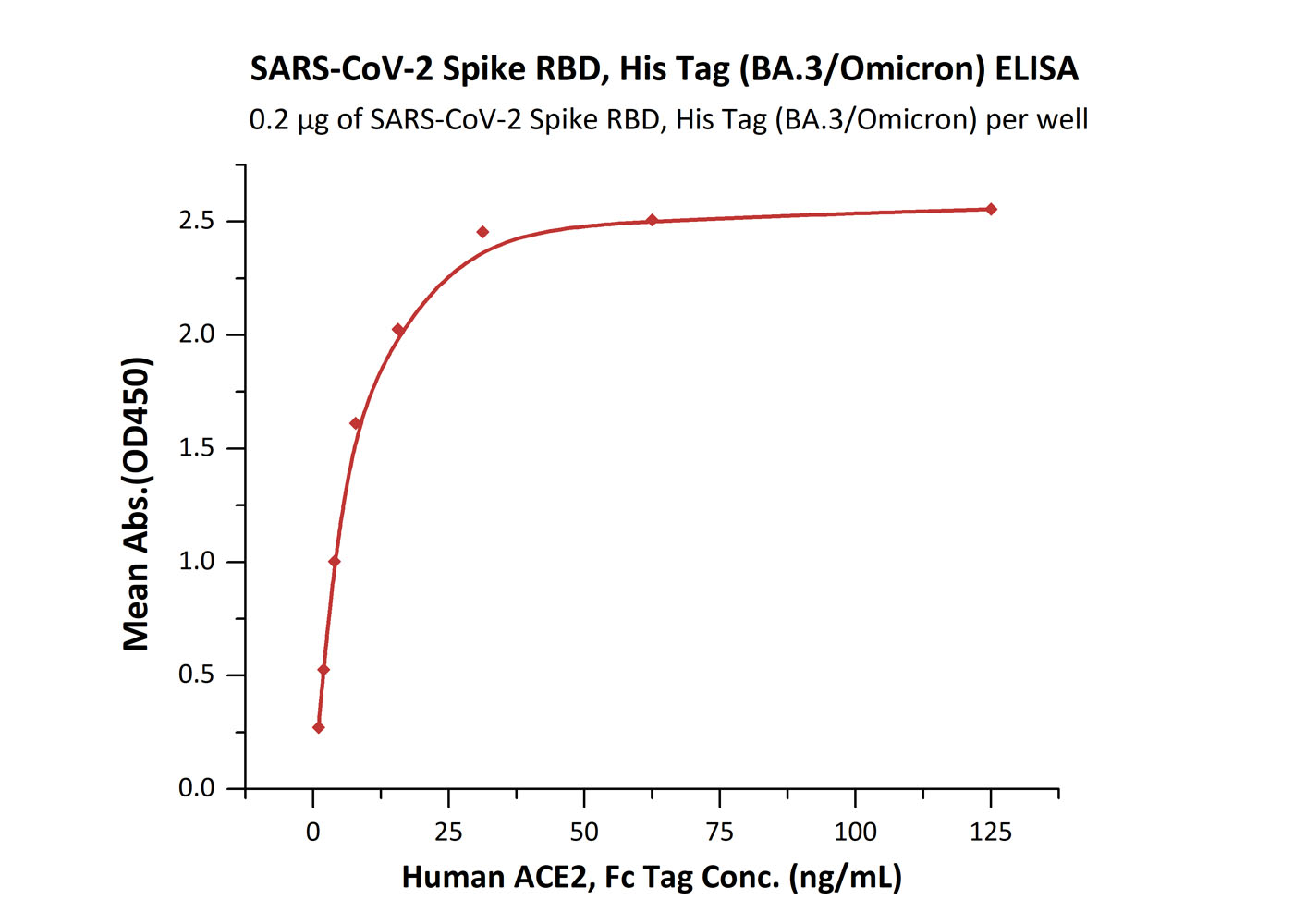 | Bio-activity : | Immobilized SARS-CoV-2 Spike RBD, His Tag (BA.3/Omicron) at 2 μg/mL (100 μL/well) can bind Human ACE2, Fc Tag with a linear range of 1-31 ng/mL. |