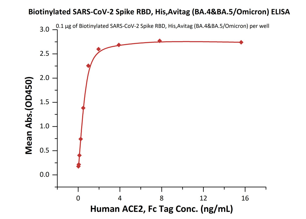 | Bio-activity : | Immobilized Biotinylated SARS-CoV-2 Spike RBD, His,Avitag (BA.4&BA.5/Omicron) at 1 μg/mL (100 μL/well) on streptavidin precoated (0.5 μg/well) plate can bind Human ACE2, Fc Tag with a linear range of 0.1-4 ng/mL. |