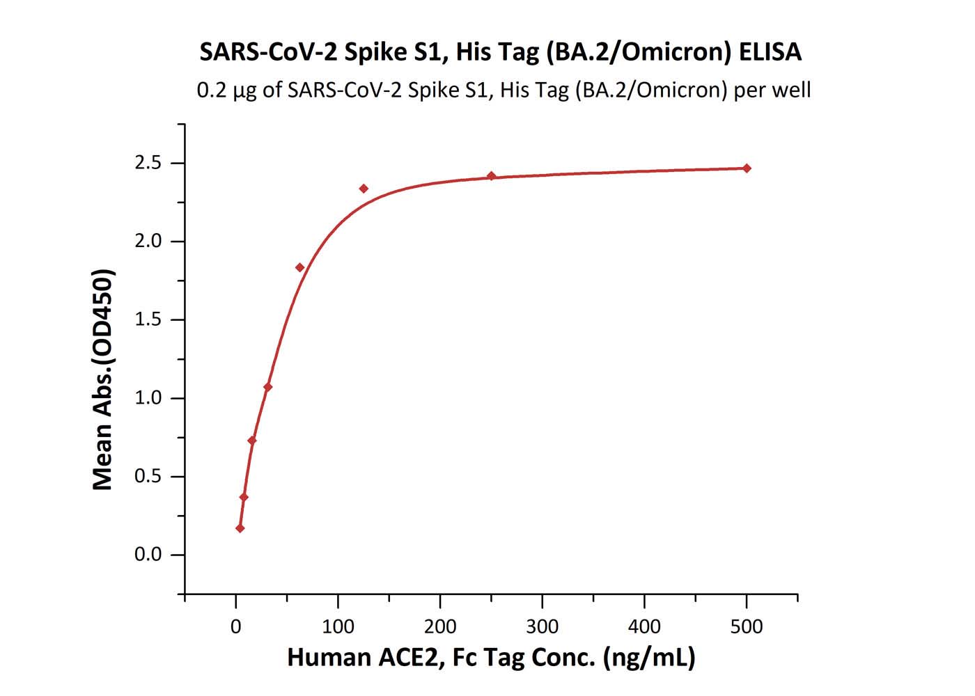 | Bio-activity : | Immobilized SARS-CoV-2 Spike S1, His Tag (BA.2/Omicron) at 2 μg/mL (100 μL/well) can bind Human ACE2, Fc Tag with a linear range of 4-125 ng/mL. |