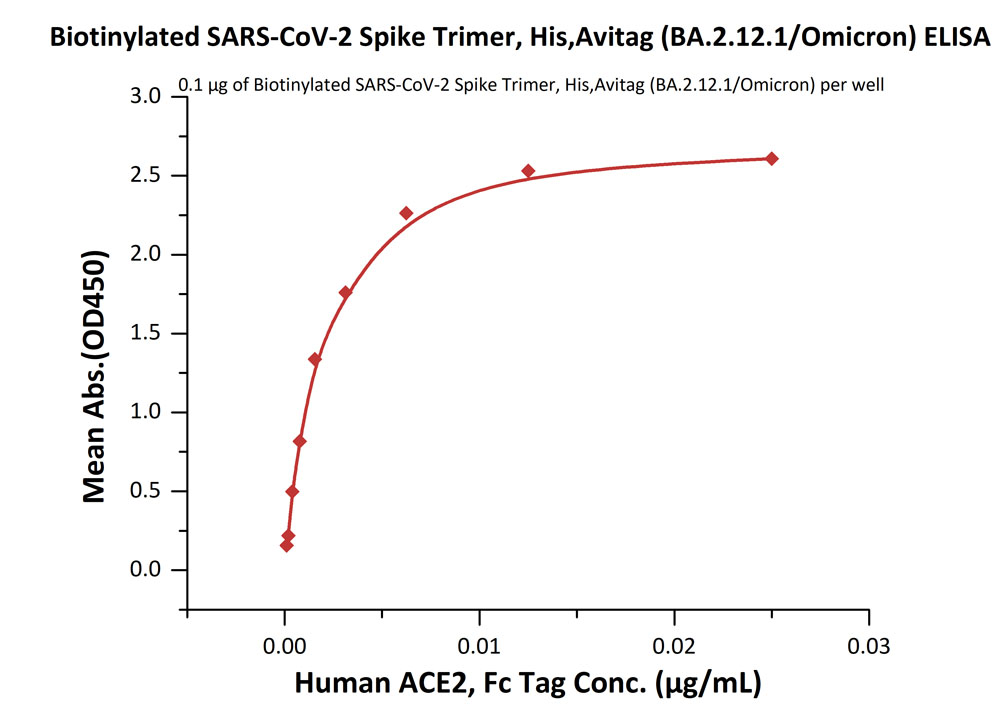 | Bio-activity : | Immobilized Biotinylated SARS-CoV-2 Spike Trimer, His,Avitag (BA.2.12.1/Omicron) at 1 μg/mL (100 μL/well) on streptavidin precoated (0.5 μg/well) plate can bind Human ACE2, Fc Tag with a linear range of 0.001-0.013 μg/mL. |