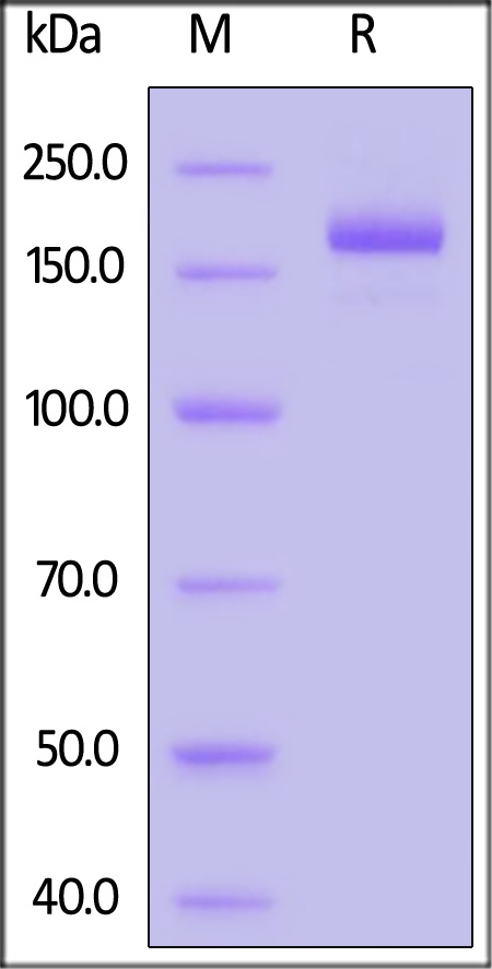 Molecular Mass : | The protein has a calculated MW of 138.0 kDa. The protein migrates as 160-190 kDa under reducing (R) condition (SDS-PAGE) due to glycosylation. |