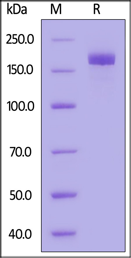 | Molecular Mass : | The protein has a calculated MW of 139.7 kDa. The protein migrates as 160-190 kDa under reducing (R) condition (SDS-PAGE) due to glycosylation. |