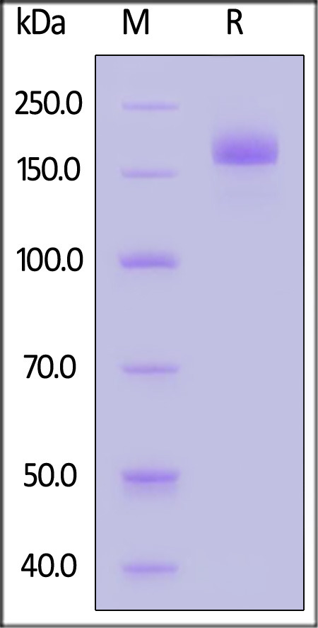 Molecular Mass : | The protein has a calculated MW of 138.0 kDa. The protein migrates as 160-190 kDa under reducing (R) condition (SDS-PAGE) due to glycosylation. |