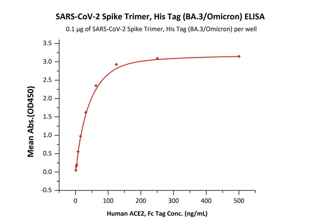 | Bio-activity : | Immobilized SARS-CoV-2 Spike Trimer, His Tag (BA.3/Omicron) at 1 μg/mL (100 μL/well) can bind Human ACE2, Fc Tag with a linear range of 2-31 ng/mL. |