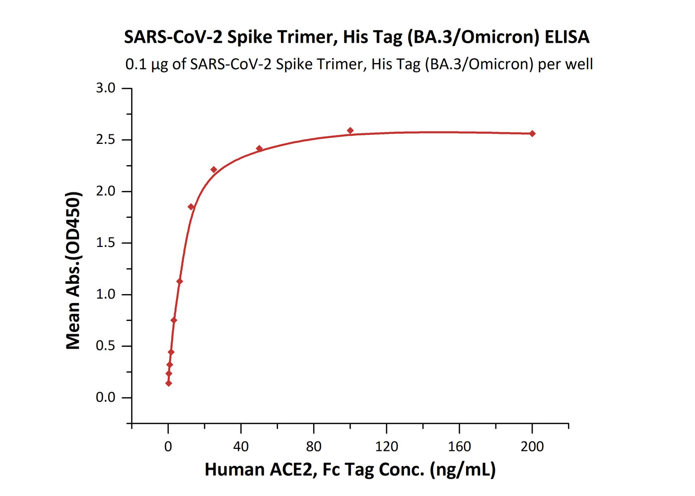 | Bio-activity : | Immobilized SARS-CoV-2 Spike Trimer, His Tag (BA.3/Omicron) at 1 μg/mL (100 μL/well) can bind Human ACE2, Fc Tag with a linear range of 0.2-25 ng/mL. |