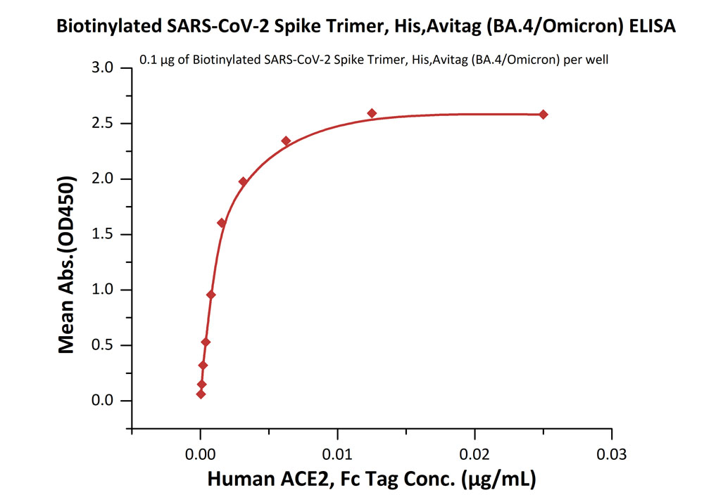 Bio-activity : Immobilized Biotinylated SARS-CoV-2 Spike Trimer, His,Avitag (BA.4/Omicron) at 1 μg/mL (100 μL/well) on streptavidin precoated (0.5 μg/well) plate can bind Human ACE2, Fc Tag with a linear range of 0.001-0.013 μg/mL.