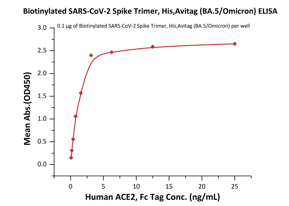 | Bio-activity : | Immobilized Biotinylated SARS-CoV-2 Spike Trimer, His,Avitag (BA.5/Omicron) at 1 μg/mL (100 μL/well) on streptavidin precoated (0.5 μg/well) plate can bind Human ACE2, Fc Tag with a linear range of 0.1-6 ng/mL. |