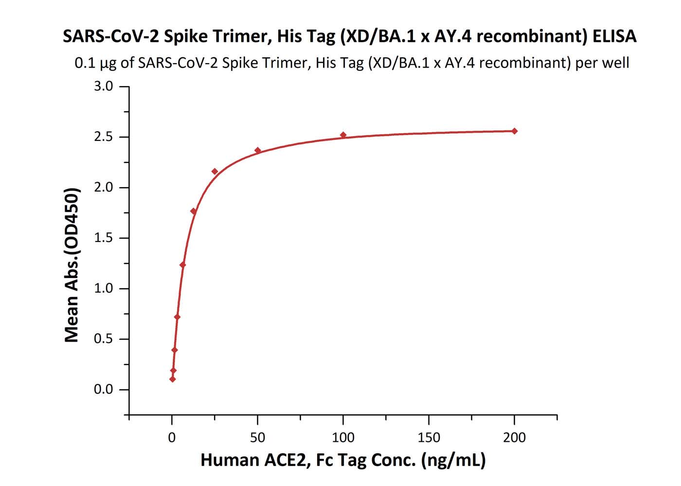 | Bio-activity : | Immobilized SARS-CoV-2 Spike Trimer, His Tag (XD/BA.1 x AY.4 recombinant) at 1 μg/mL (100 μL/well) can bind Human ACE2, Fc Tag with a linear range of 0.4-25 ng/mL. |