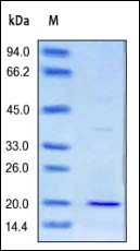 Molecular Mass : | The protein has a calculated MW of 16.1 kDa. As a result of glycosylation, the protein migrates as 18-23 kDa under reducing (R) condition, and 33-40 kDa under non-reducing (NR) condition (SDS-PAGE). |