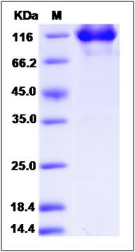 The recombinant cynomolgus DPP4 is a disulfide-linked homodimer. The reduced monomer comprises 993 amino acids and has a calculated molecular mass of 112.9 KDa.The apparent molecular mass of the protein is approximately 113 KDa in SDS-PAGE. |