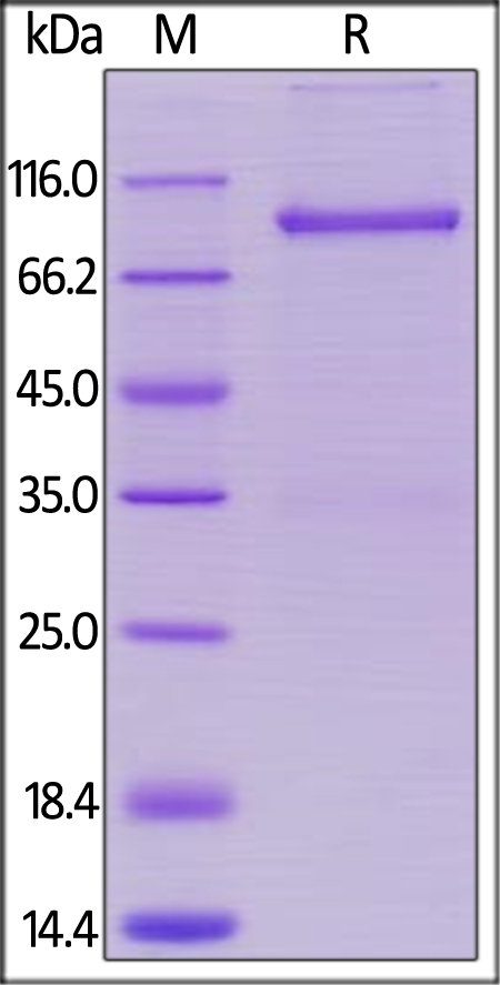 | Molecular Mass : | This protein carries a mouse IgG2a Fc tag at the C-terminus.The protein has a calculated MW of 73.5 kDa. The protein migrates as 80-90 kDa under reducing (R) condition (SDS-PAGE) due to glycosylation. |