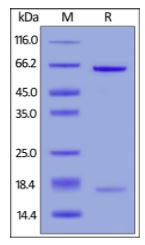| Molecular Mass : | This protein carries a polyhistidine tag at the C-terminus. This protein undergoes autocatalytic cleavage to release the pro-peptide and mature chain. The pro-peptide and mature chain are associated through non‑covalent interactions and with a calculated MW of 13.9 kDa and 59.3 kDa respectively. The protein migrates as 17 kDa and 65 kDa under reducing (R) condition (SDS-PAGE) due to glycosylation. |