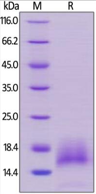 | Molecular Mass : | The protein has a calculated MW of 7.9 kDa. The protein migrates as 14-16 kDa under reducing (R) condition (SDS-PAGE) due to glycosylation. |