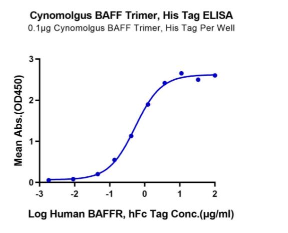 | Bio-activity : | Immobilized Cynomolgus BAFF Trimer, His Tag at 1μg/ml (100μl/Well) on the plate. Dose response curve for Human BAFFR, hFc Tag with the EC50 of 0.53μg/ml determined by ELISA. |