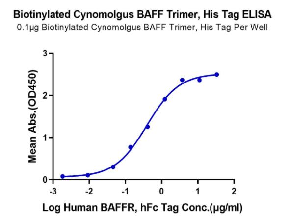 | Bio-activity : | Immobilized Biotinylated Cynomolgus BAFF Trimer, His Tag at 1μg/ml (100μl/Well) on the plate. Dose response curve for Human BAFFR, hFc Tag with the EC50 of 0.39μg/ml determined by ELISA. |