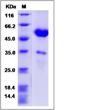Molecular Mass : The recombinant cynomolgus TNFSF4 is a disulfide-linked homodimer. The reduced monomer comprises 369 amino acids and has a calculated molecular mass of 42 KDa.The apparent molecular mass of it is approximately 48 KDa respectively in SDS-PAGE.