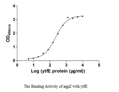 | Bio-activity : | Measured by its binding ability in a functional ELISA. Immobilized aqpZ at 5 μg/ml can bind E.coli ytfE, the EC50 of E.coli ytfE protein is 197.90-259.70 μg/ml. |