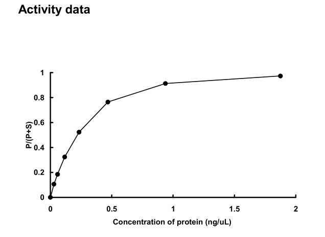 | Bio-activity : | The activity was measured by off-chip mobility shift assay. The enzyme was incubated with fluorecence-labeled substrate and Mg(or Mn)/ATP. The phosphorylated and unphosphorylated substrates were separated and detected by LabChip™3000. |