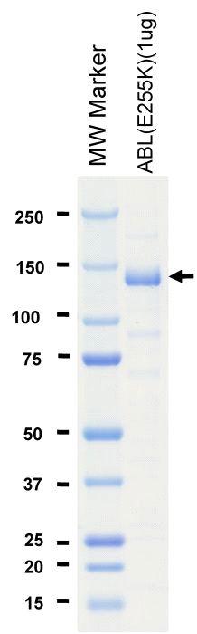 | Product Overview : | Full-length human ABL [2-1130(end) amino acids and E255K of accession number NP_005148.2] was expressed as N-terminal His-tagged protein (126 kDa) using baculovirus expression system. His-tagged ABL[E255K] was purified by using Ni-NTA affinity chromatography . |