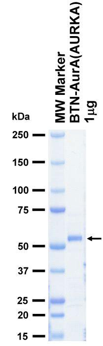 | Product Overview : | Full-length human AurA [1-403(end) amino acids of accession number NP_940835.1] was expressed as N-terminal DYKDDDDK tagged, biotinylated protein (50 kDa) using baculovirus expression system. The protein was purified by using DYKDDDDK tag antibody agarose. |