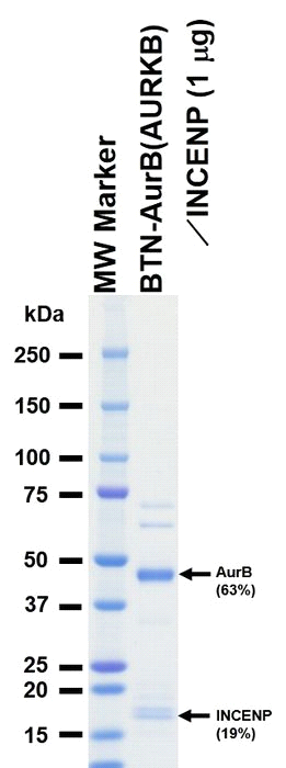 | Product Overview : | Full-length human AurB [1-344(end) amino acids of accession number Q96GD4] was co-expressed as N- terminal DYKDDDDK tagged, biotinylated protein (43 kDa) with His-tagged INCENP(INBOX) [803- 918(end) amino acids of accession number AAU04398] using baculovirus expression system. The protein was purified by using DYKDDDDK tag antibody agarose and activated with ATP. Activated protein was purified by using gel filtration. |