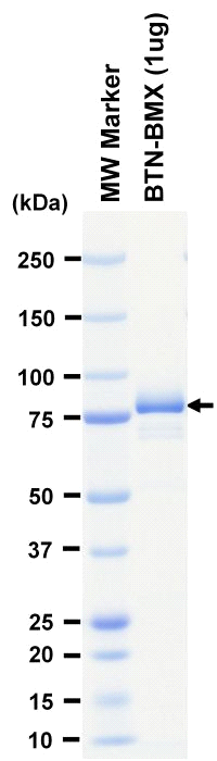 | Product Overview : | Full-length human BMX [1-675(end) amino acids of accession number NP_001712.1] was expressed as N-terminal DYKDDDDK tagged, biotinylated protein (82 kDa) using baculovirus expression system. The protein was purified by using DYKDDDDK tag antibody agarose. |
