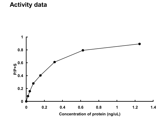 | Bio-activity : | The activity was measured by off-chip mobility shift assay. The enzyme was incubated with fluorecence-labeled substrate and Mg(or Mn)/ATP. The phosphorylated and unphosphorylated substrates were separated and detected by LabChip™3000. |
