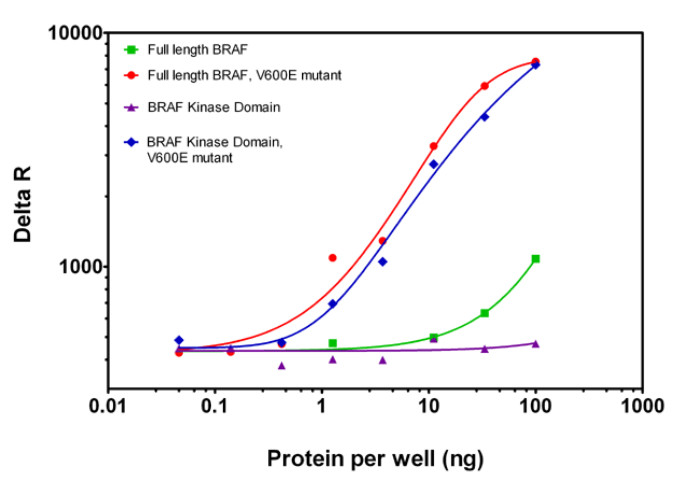 BRAF kinase activity was measured in an HTRF assay. Varying concentrations of BRAF were added to a reaction mix containing ATP and a biotinylated kinase substrate (HTRF substrate 2) and was incubated at 37 centigrade for phosphorylation. HTRF detection reagents were then added, the reaction was incubated for 30 minutes at room temperature. Time-resolved fluorescent signal (Delta R) was measured on a Flexstation 3 microplate reader. |