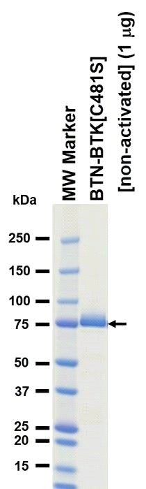 | Product Overview : | Full-length human BTK [2-659(end) amino acids and C481S of accession number NP_000052.1] was expressed as N-terminal DYKDDDDK tagged, biotinylated protein (80 kDa) using baculovirus expression system. The protein was purified by using DYKDDDDK tag antibody agarose. |
