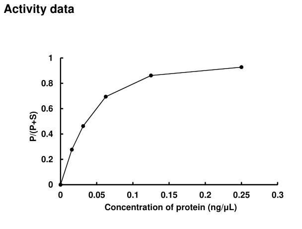 | Bio-activity : | The activity was measured by off-chip mobility shift assay(MSA). The enzyme was incubated with fluorecence-labeled substrate and Mg(or Mn)/ATP. The phosphorylated and unphosphorylated substrates were separated and detected by MSA device. |