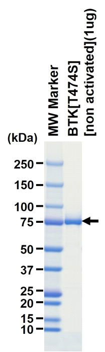 | Product Overview : | Full-length human BTK [2-659(end) amino acids and T474S of accession number NP_000052.1] was expressed as N-terminal DYKDDDDK tagged, biotinylated protein (80 kDa) using baculovirus expression system. The protein was purified by using DYKDDDDK tag antibody agarose. |