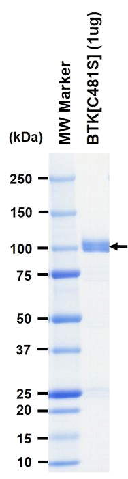 | Product Overview : | Full-length human BTK [2-659(end) amino acids and C481S of accession number NP_000052] was expressed as N-terminal GST-fusion protein (103 kDa) using baculovirus expression system. GST- BTK[C481S] was purified by using glutathione sepharose chromatography. |