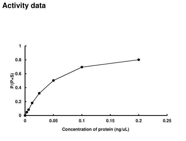 | Bio-activity : | The activity was measured by off-chip mobility shift assay. The enzyme was incubated with fluorecence-labeled substrate and Mg(or Mn)/ATP. The phosphorylated and unphosphorylated substrates were separated and detected by LabChip™3000. |