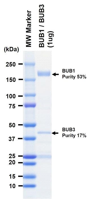 | Product Overview : | Full-length human BUB1 [1-1085 (end) amino acids of accession number NP_004327] was co-expressed as N-terminal GST-fusion protein (149 kDa) with DYKDDDDK tagged BUB3 [1-328 (end) amino acids of accession number NP_004716] using baculovirus expression system. GST-BUB1 was purified by using glutathione sepharose chromatography. |