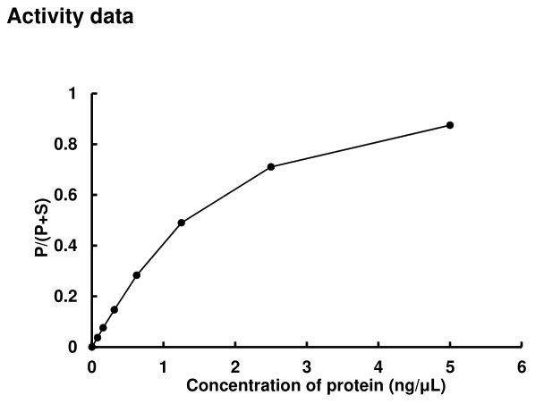 | Bio-activity : | The activity was measured by off-chip mobility shift assay(MSA). The enzyme was incubated with fluorecence-labeled substrate and Mg(or Mn)/ATP. The phosphorylated and unphosphorylated substrates were separated and detected by MSA device. |