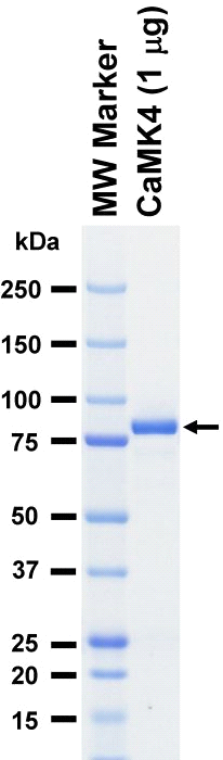 | Product Overview : | Full-length human CaMK4 [1-473(end) amino acids of accession number NP_001735.1] was expressed as N-terminal GST-fusion protein (79 kDa) using baculovirus expression system. GST-CaMK4 was purified by using glutathione sepharose chromatography. |