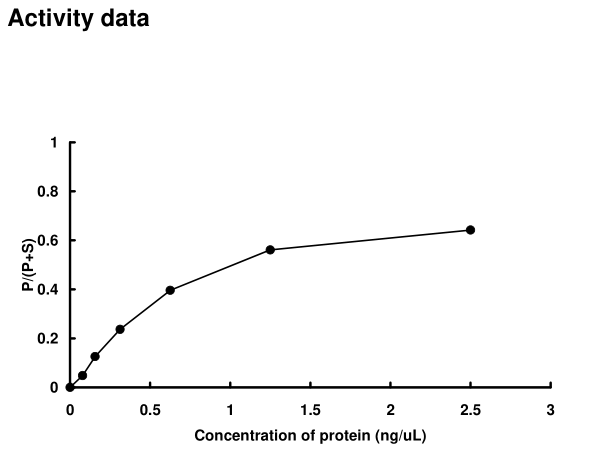 | Bio-activity : | The activity was measured by off-chip mobility shift assay(MSA). The enzyme was incubated with fluorecence-labeled substrate, Mg(or Mn)/ATP, and Ca/Calmodulin . The phosphorylated and unphosphorylated substrates were separated and detected by MSA device. |