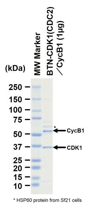 Product Overview : | Full-length human CDK1 [1-297(end) amino acids of accession number NP_001777.1] was co-expressed as N-terminal DYKDDDDK tagged, biotinylated protein (38 kDa) with His-CyclinB1 [1-433(end) amino acids of accession number NP_114172.1] using baculovirus expression system. The protein was purified by using DYKDDDDK tag antibody agarose. |