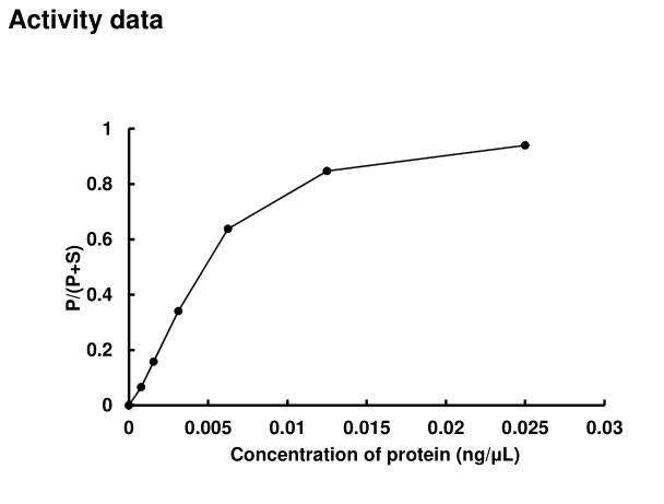 | Bio-activity : | The activity was measured by off-chip mobility shift assay(MSA). The enzyme was incubated with fluorecence-labeled substrate and Mg(or Mn)/ATP. The phosphorylated and unphosphorylated substrates were separated and detected by MSA device. |